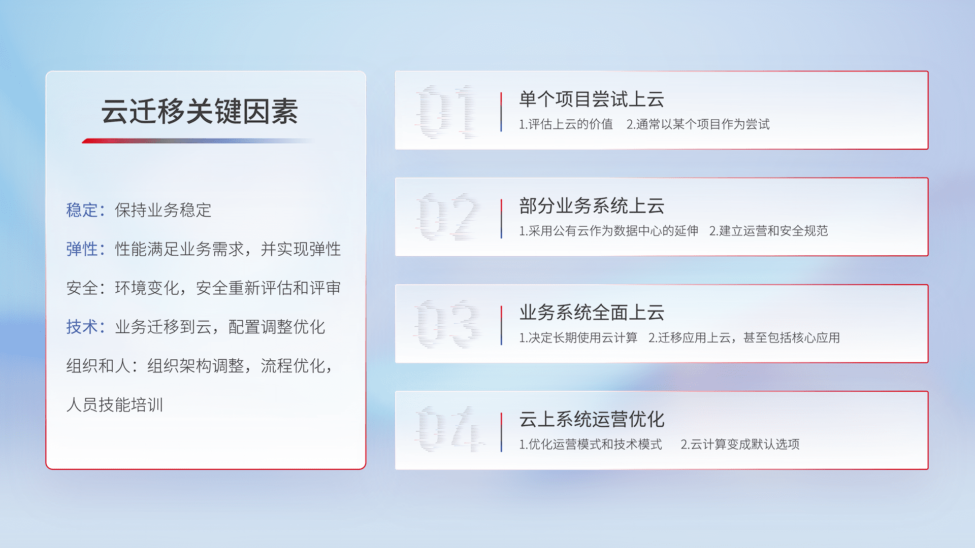 结合实际业务,,,从规划设计、、云平台选型、、云原生改造、、数据迁移、、、集成交付,,,迁移全过程为客户识别最佳上云路径,,做好风险识别管理,,,,设计网络架构、、、身份权限、、、安全审计合规、、、、操作审计、、、、日志审计、、、监控告警策略、、、多站点容灾设计等,,对云上基础设施进行整体规划,,,提升IT治理水平,,,,以满足弹性、、、高可用、、、、高性能的需求。。。。