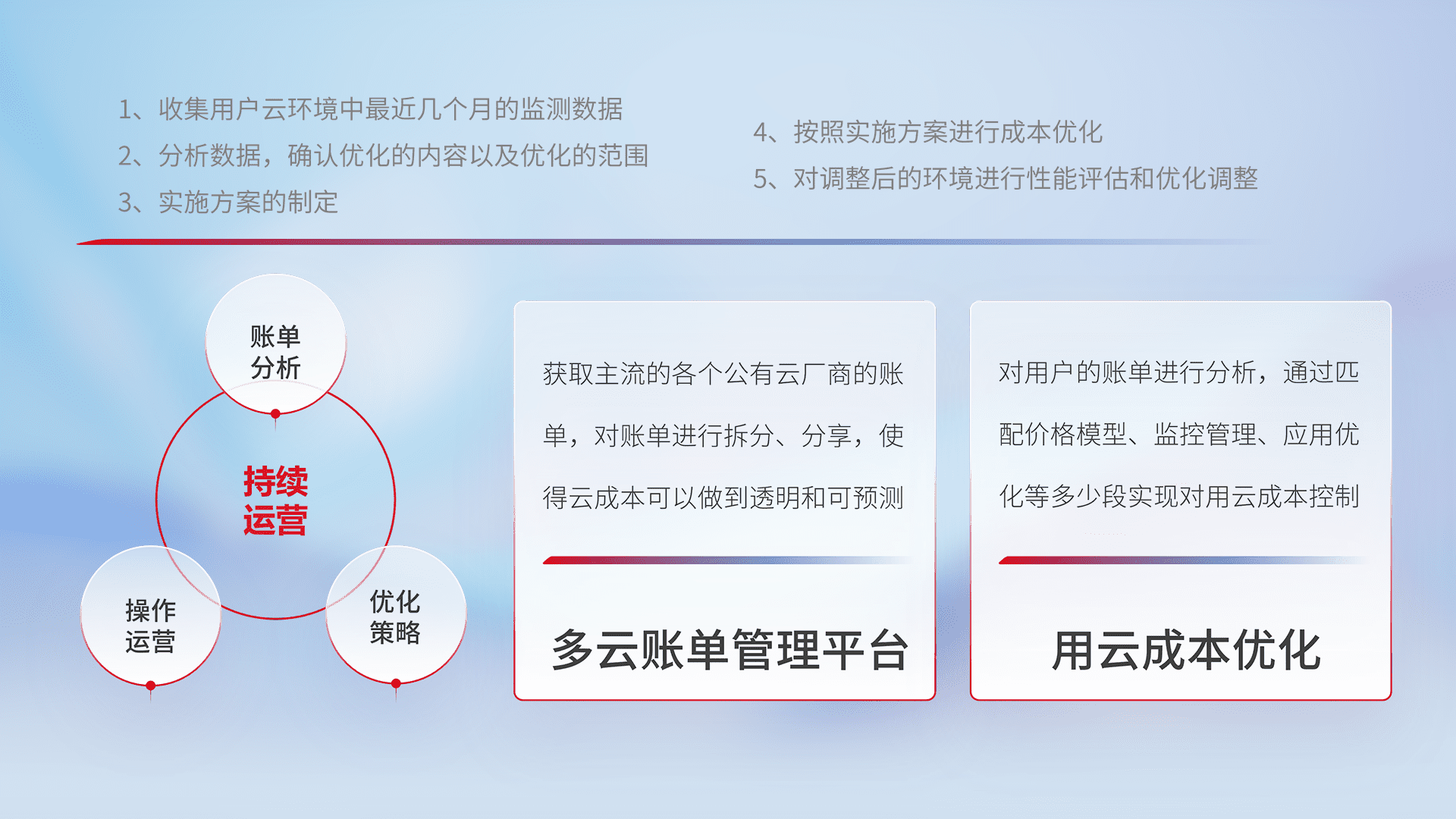 通过多云纳管,,,,以统一的资源数据模型把客户的云资源进行抽象和封装,,,进而实现对多云资源的统一操作,,保障云资源管理的可靠性、、、、稳定性与可用性。。量身定制化运维内容,,,配置、、开发运维、、、、补丁管理、、备份、、监控、、、认证和访问管理、、审计和日常巡检等,,,,保障在用云过程中的可靠度,,,,稳定度以及高可用率。。