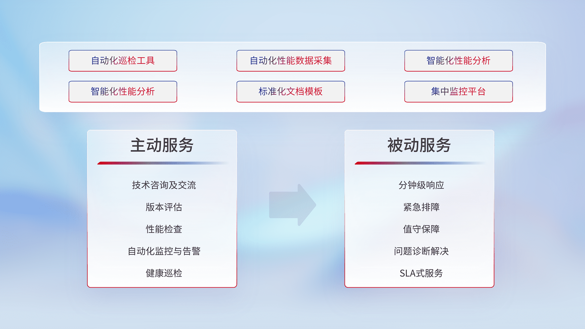 智能化工具和标准化文档,,,保障服务质量,,提供主动服务(包含技术咨询、、、版本评估、、、、性能检查、、、、自动化监控与告警、、健康巡检)和被动服务包含(分钟级响应、、、、紧急排障、、值守保障、、、问题诊断解决、、SLA服务)。。。。